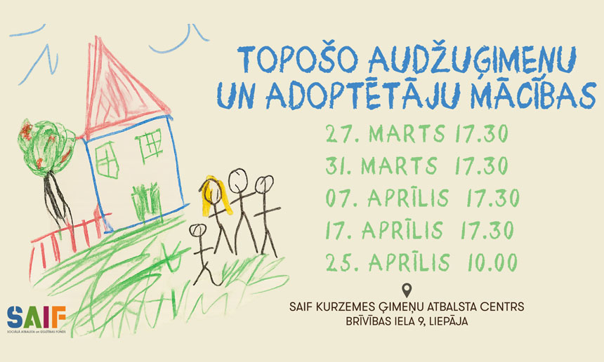 No š.g. 27. marta reizi nedēļā “Sociālā atbalsta un izglītības fonda” (SAIF) Kurzemes ģimeņu atbalsta centrā norisināsies bezmaksas topošo audžuģimeņu un adoptētāju mācības, lai informētu un izglītotu sabiedrību par audžuģimeņu jautājumiem un bērnu uzņemšanas iespējām ģimenēs. Pieteikšanās mācībām, zvanot pa tālruni 29110236, rakstot uz e-pastu [email protected] vai klātienē, SAIF Kurzemes ģimeņu atbalsta centrā, Liepājā.
